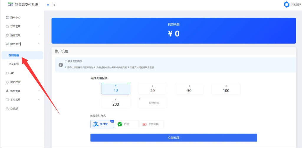 【财务中心】-【在线充值】-选择自己要充值的金额